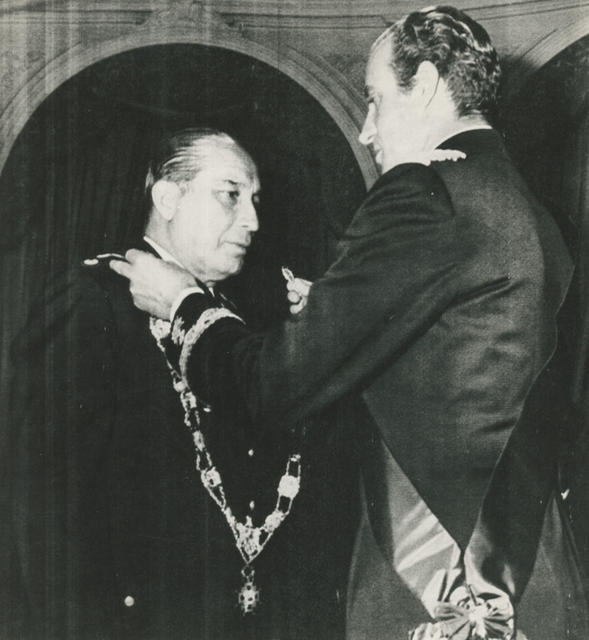 El Rey impone el collar de la Orden de Isabel la Católica al Presidente de Perú, Morales Bermúdez