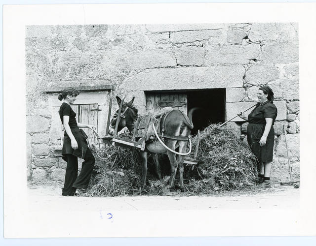Retrato de la vida en el campo. Retrato de dos mujeres descargando una mula