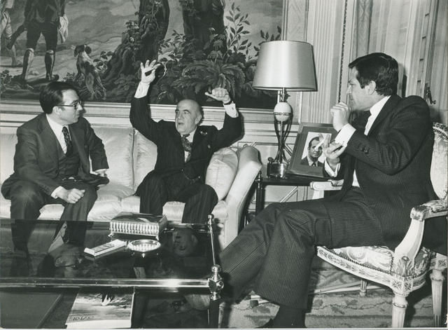 El Presidente del Gobierno, Adolfo Suárez, acompañado del Ministro de Asuntos Exteriores, Sr. Oreja, recibe en el Palacio de la Moncloa al Primer Ministro de Irán, Amir Abbas Hoveyda, durante su visita oficial